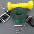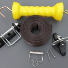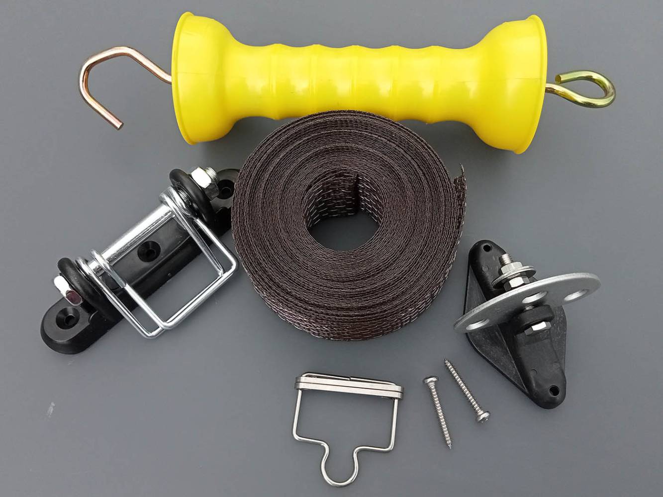 10 Mtr tape, gate handle with internal spring, gate latch and 2 screws, insulator end, and gate link. Available in either green or brown while stocks last.